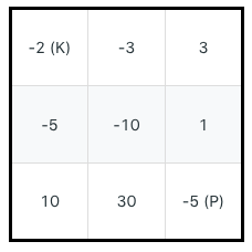 The demons had captured the princess (P) and imprisoned her in the bottom-right corner of a dungeon. The dungeon consists of M x N rooms laid out in a 2D grid. Our valiant knight (K) was initially positioned in the top-left room and must fight his way through the dungeon to rescue the princess.