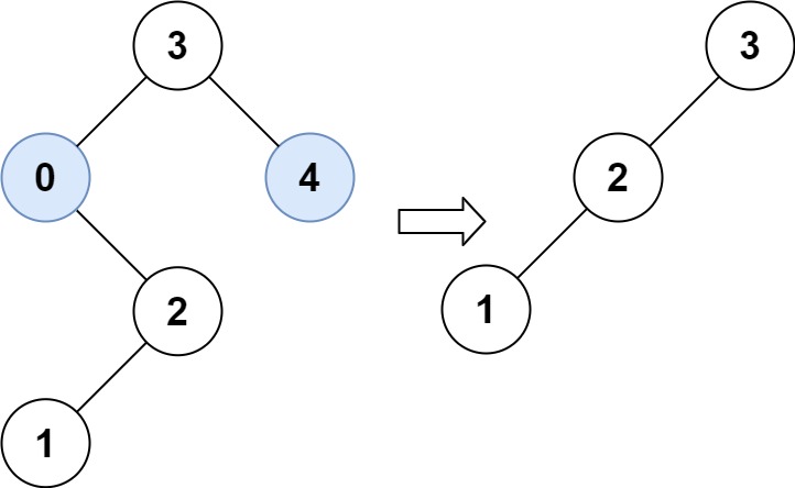 Input: root = [3,0,4,null,2,null,null,1], low = 1, high = 3