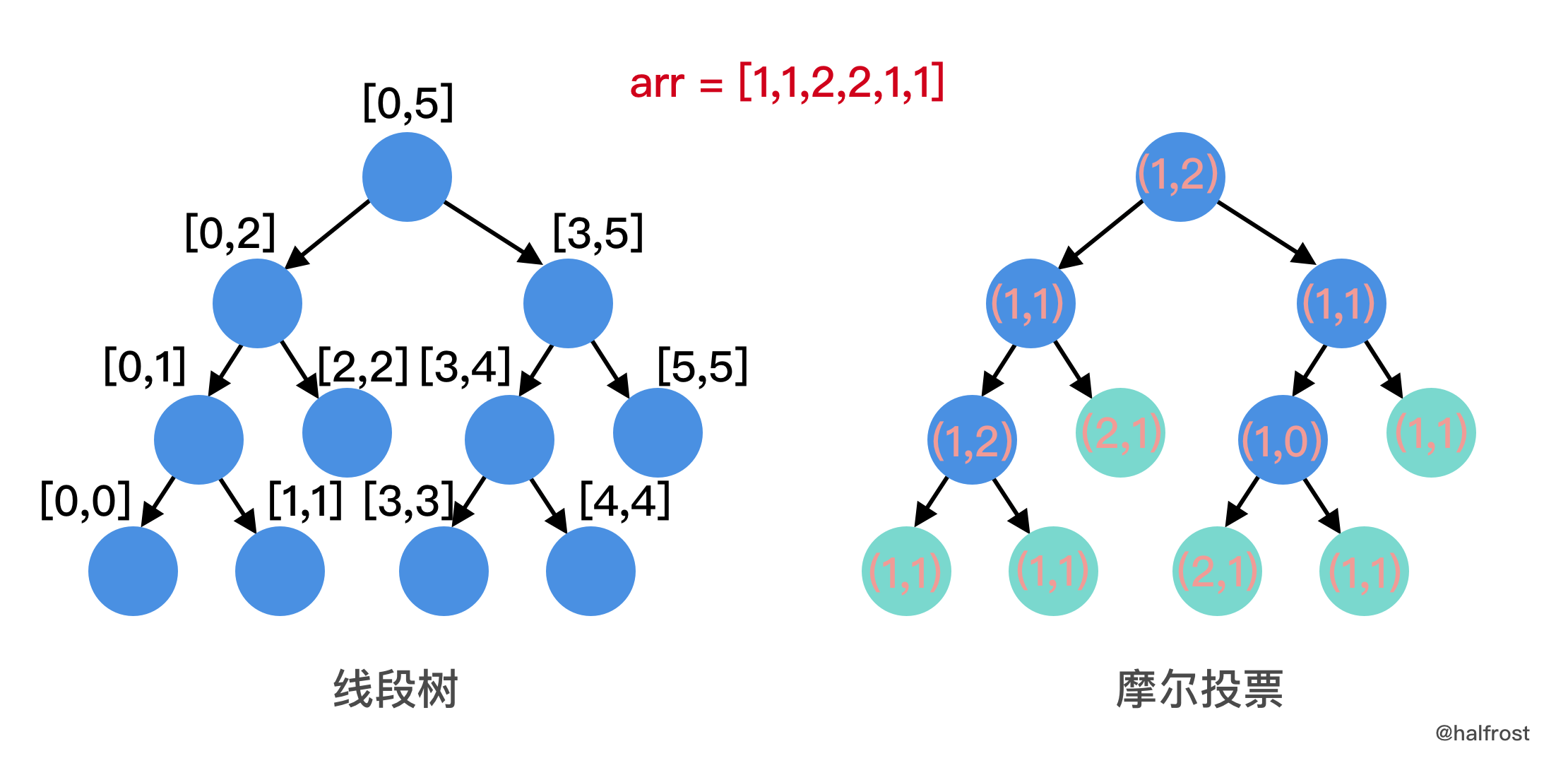 摩尔投票的思想是用两个变量,candidate 和 count,用来记录待被投票投出去的元素,和候选人累积没被投出去的轮数。如果候选人累积没有被投出去的轮数越多,那么最终成为众数的可能越大。从左往右扫描整个数组,先去第一个元素为 candidate,如果遇到相同的元素就累加轮数,如果遇到不同的元素,就把 candidate 和不同的元素一起投出去。当轮数变成 0 了,再选下一个元素作为 candidate。从左扫到右,就能找到众数了。那怎么和线段树结合起来呢?