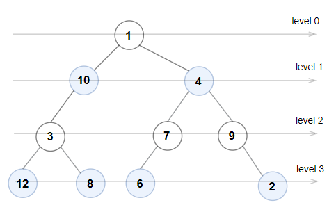 A binary tree is named Even-Odd if it meets the following conditions: