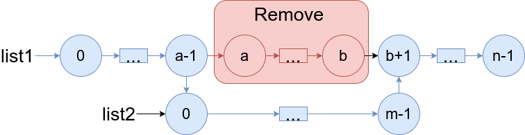 给你两个链表 list1 和 list2 ,它们包含的元素分别为 n 个和 m 个。请你将 list1 中第 a 个节点到第 b 个节点删除,并将list2 接在被删除节点的位置。