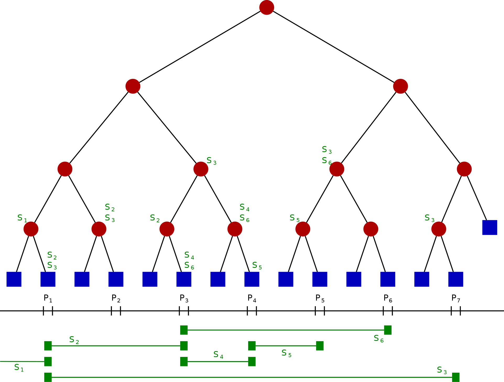 - Mỗi nốt (kể cả lá) có một cấu trúc để lưu các đoạn. Nếu một đoạn S bao phủ Int(N) nhưng không bao phủ Int(parent(N)) (tức là nốt cha của N), thì S sẽ được lưu tại nốt N.