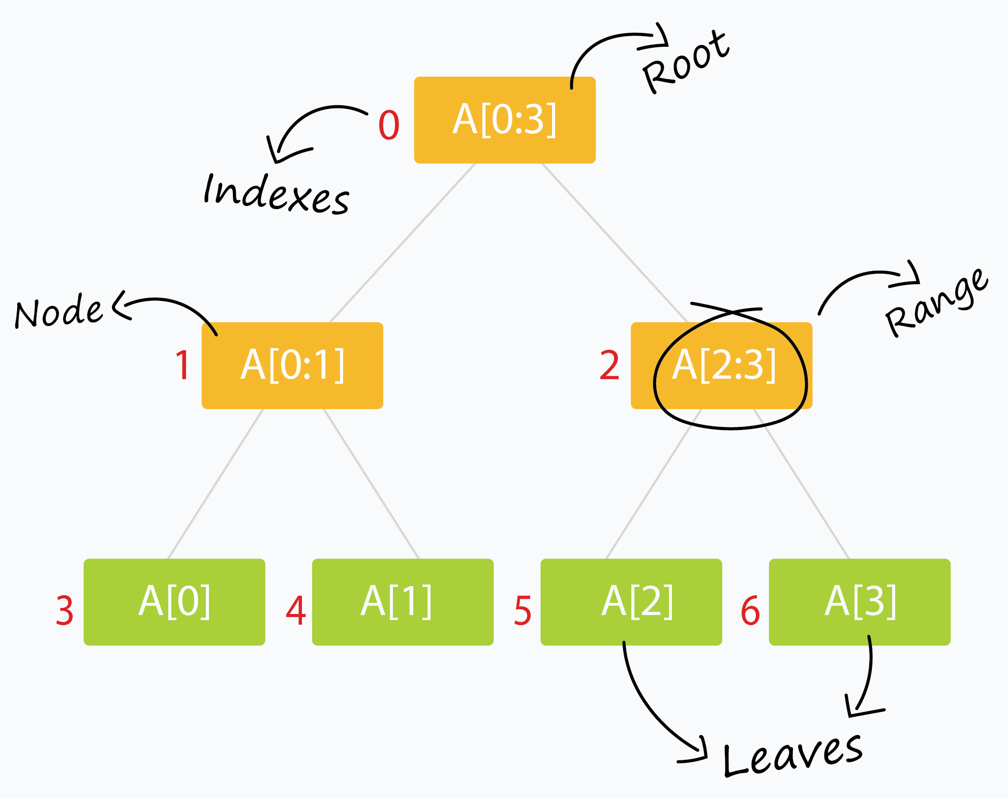 arr[0:n-1]. - Mỗi lá (leaf) đại diện cho một đoạn chỉ có 1 phần tử: