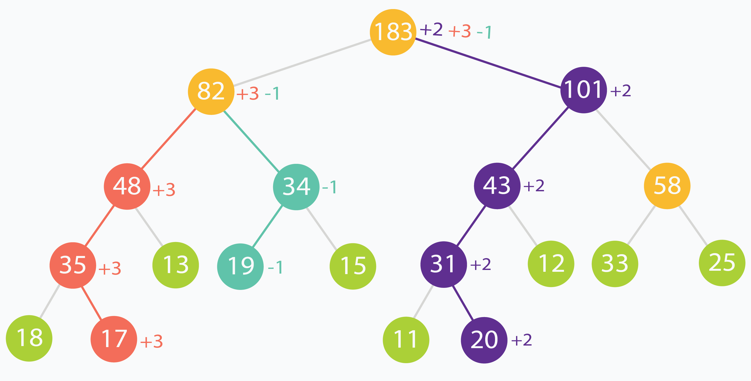 Trong ví dụ này, các phần tử ở chỉ số (trong dữ liệu gốc) 1, 3 và 6 lần lượt thay đổi +3, -1, +2. Bạn có thể thấy thay đổi được lan dần lên tới nốt gốc.