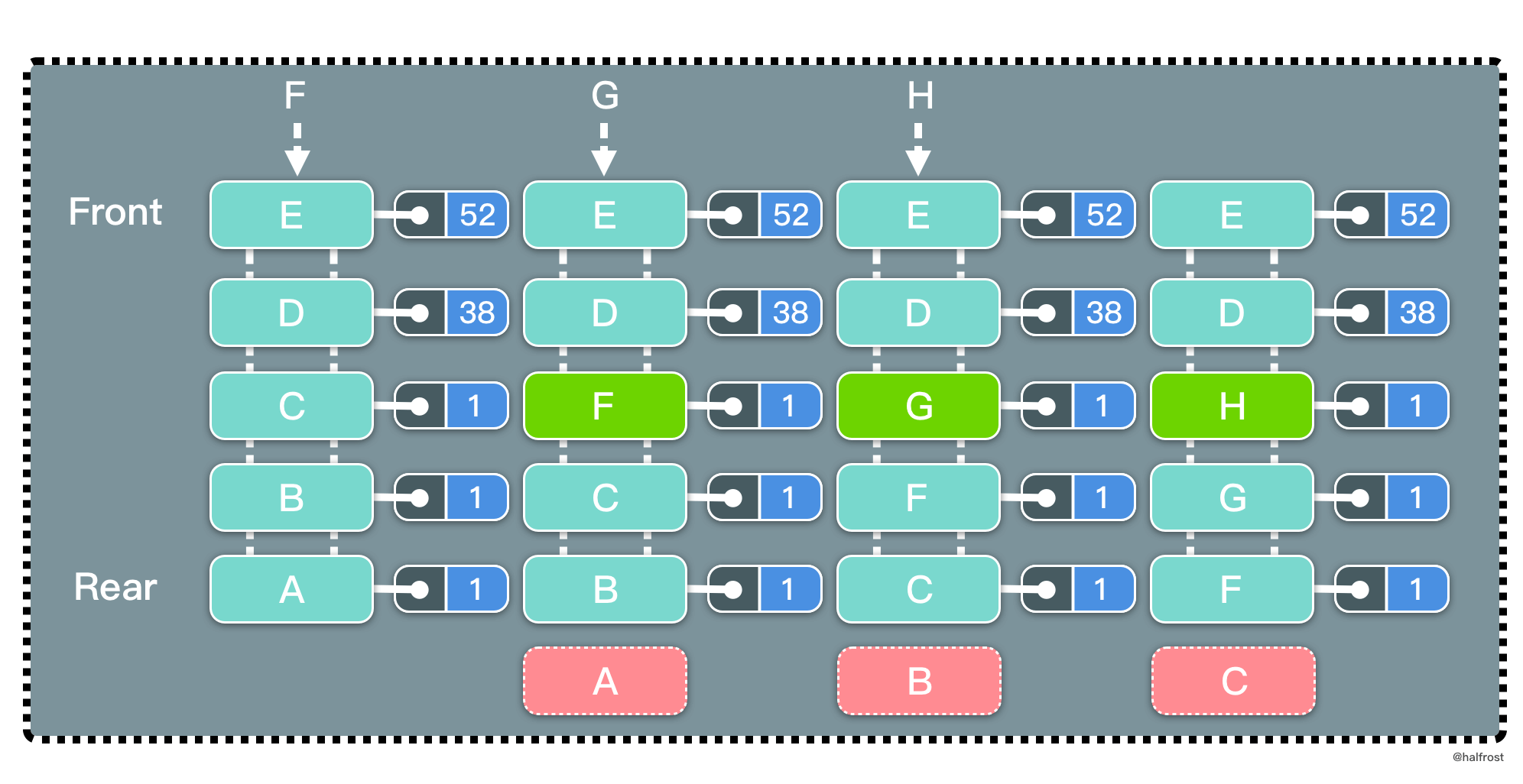 key -> node: node lưukey-value-frequency(so với LRU thì thêmfrequency). Danh sách liên kết đôi ở đây đóng vai trò tương tự LRU: dựa vào key để cập nhật node, và dựa vào key/frequency trong node để cập nhật ngược lại các map. Minh hoạ: