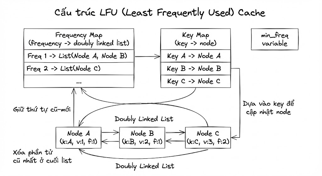 Nếu bắt đầu nghĩ tới thuật toán sắp xếp (sorting) thì bạn đang đi lệch hướng, vì sorting ít nhất cũng . Nhìn lại cơ chế LFU sẽ thấy: nó chỉ quan tâm tới frequency nhỏ nhất (min frequency). Thứ tự giữa các frequency khác nhau không cần "sắp" toàn cục.