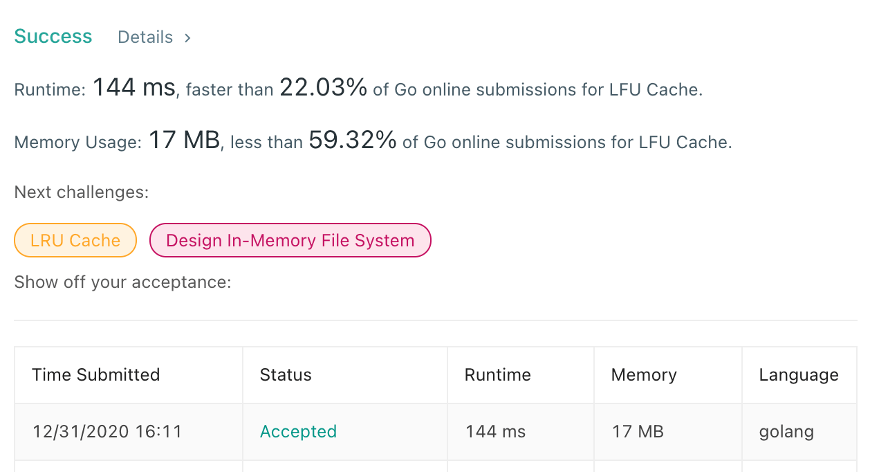 Với cách dùng min-heap, phần tác giả ghi rằng Put có độ phức tạp , Get cũng , kém hơn bản dùng 2 map. Nhưng khá thú vị là phiên bản min-heap lại "beats 100%".