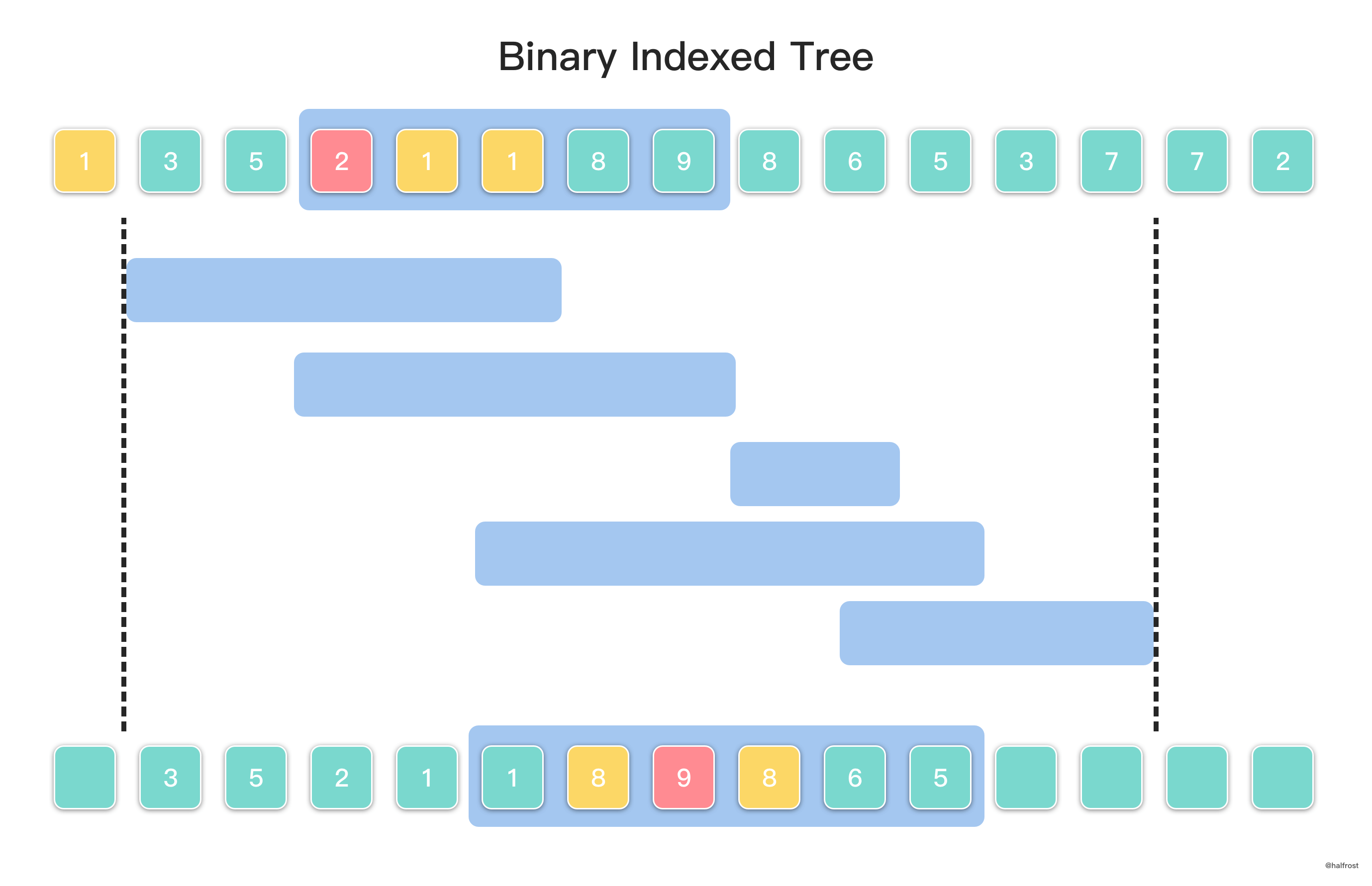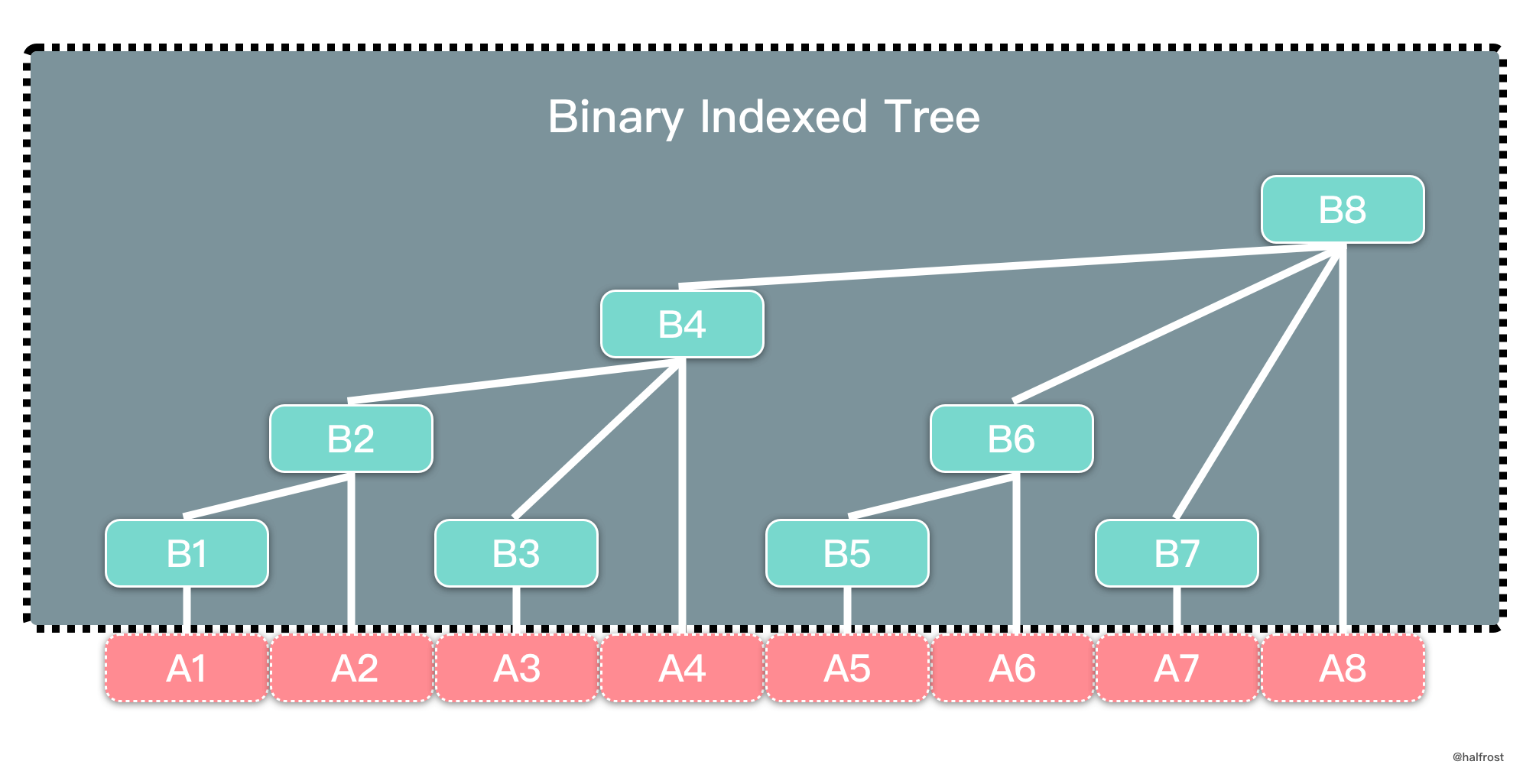 Các nút có chỉ số chẵn có thể xem như “nút cha” (parent) — lưu tổng trên một đoạn. Ví dụ B4 lưu .