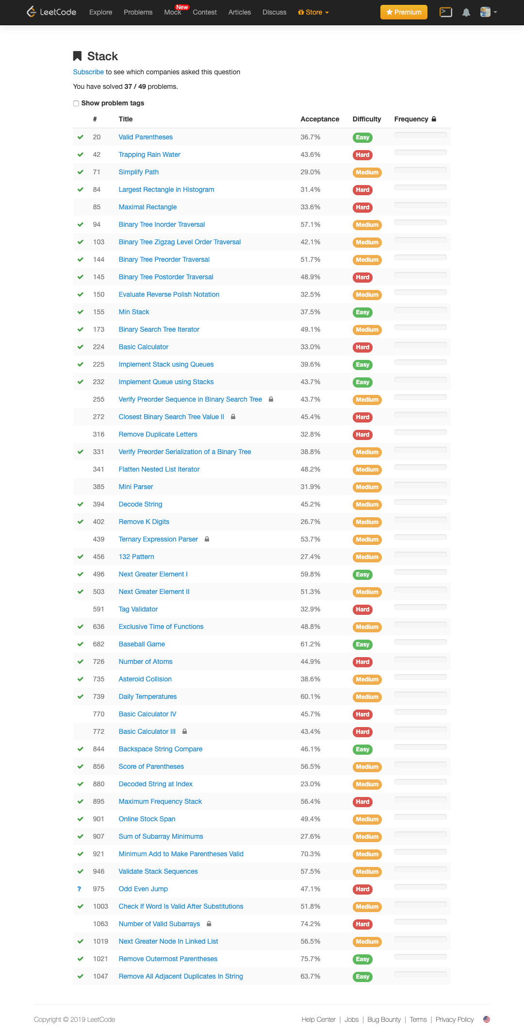 | 0032 | Chuỗi dấu ngoặc hợp lệ dài nhất (Longest Valid Parentheses) | Go | Hard | 32.8% | |||